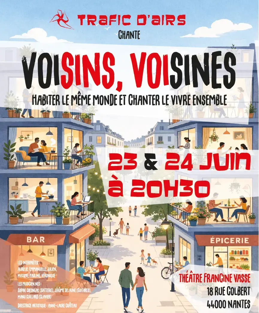 A travers une sélection de titres actuels, le concert "Voisins, voisines" met en lumière les multiples visages du "vivre ensemble" aujourd’hui. Les chansons choisies interrogent les relations de proximité, l’ouverture à l’autre et la manière dont nos histoires personnelles se croisent avec l’histoire collective. Derrière les portraits, parfois drôles ou tendres, se dessine une réflexion plus large sur la société contemporaine : celle des frontières, des rencontres et des solidarités.